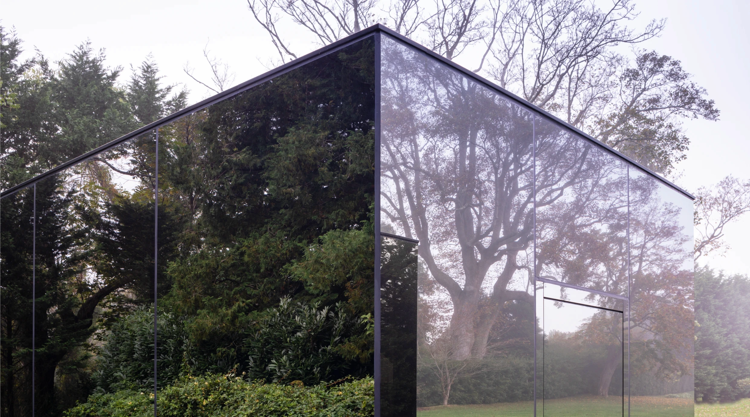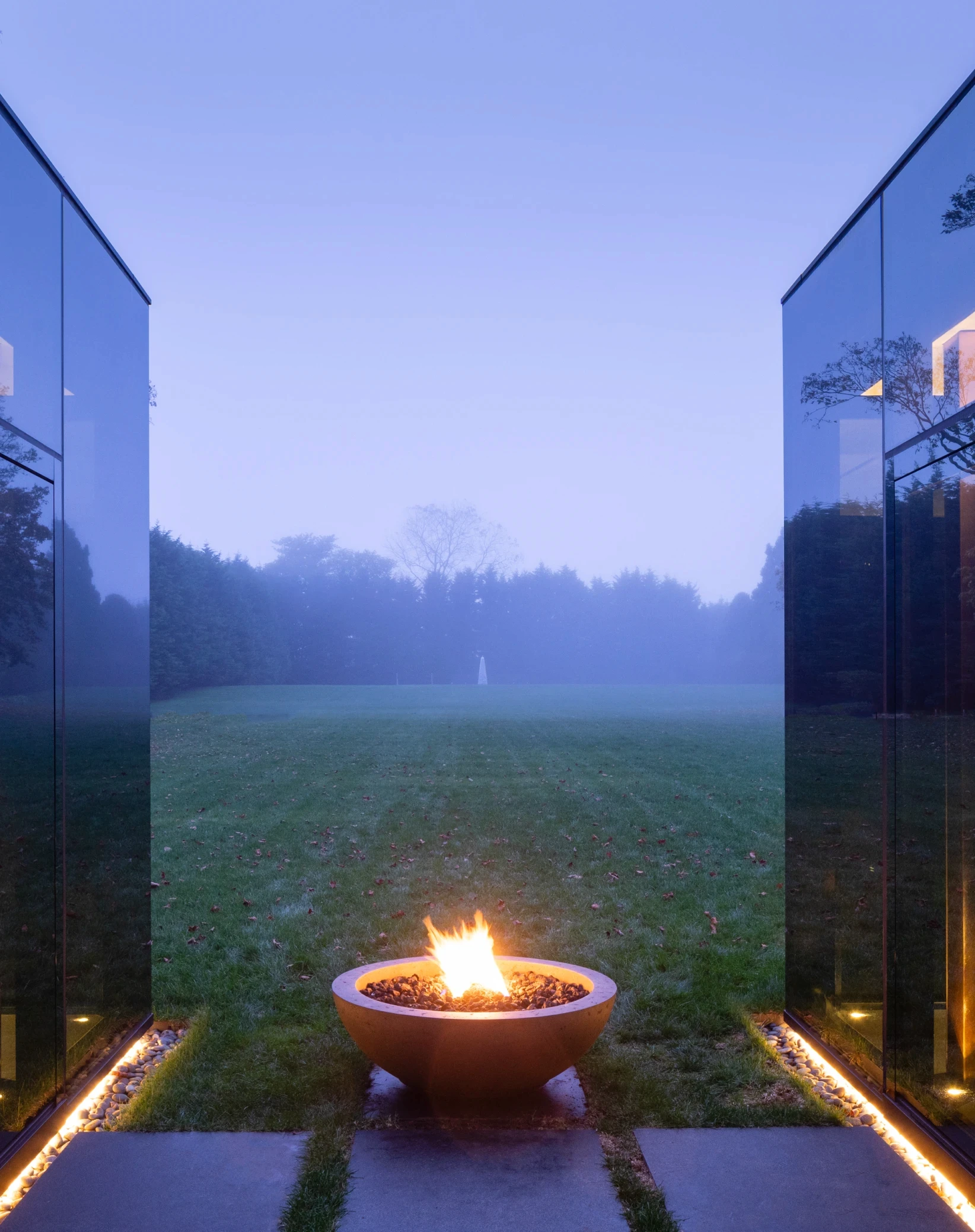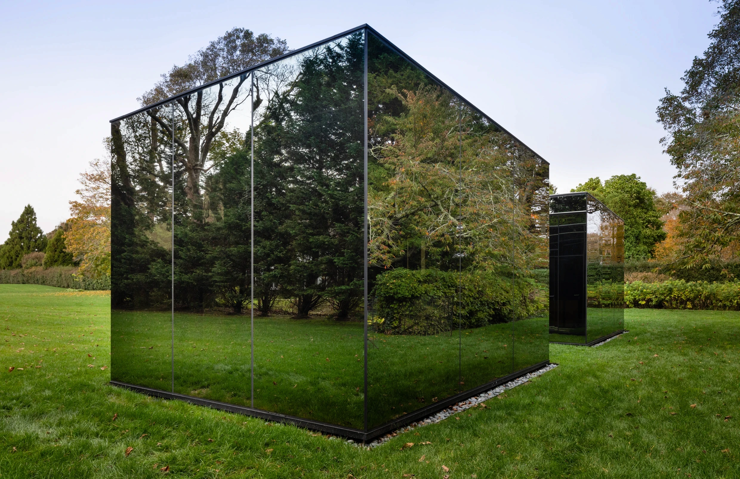 The structures are built from steel, concrete, and glass — a material palette chosen not for austerity but for disappearance. Full-height glass walls and floor-to-ceiling doors dissolve the boundary between inside and out, allowing the surrounding estate to remain the subject.