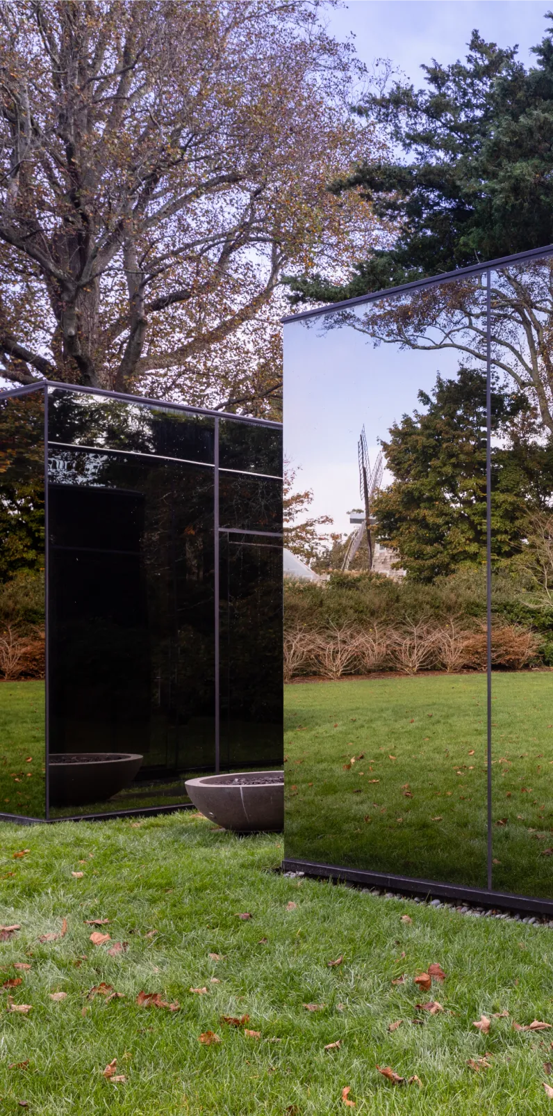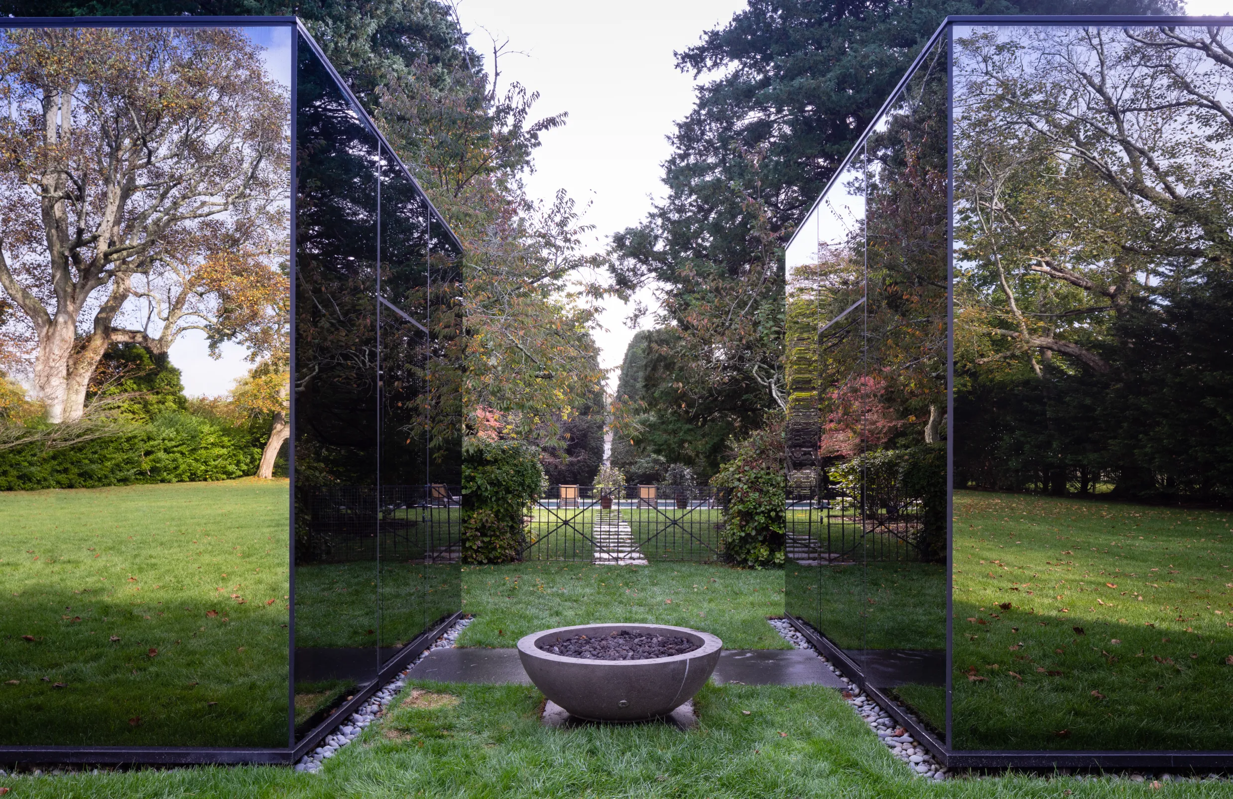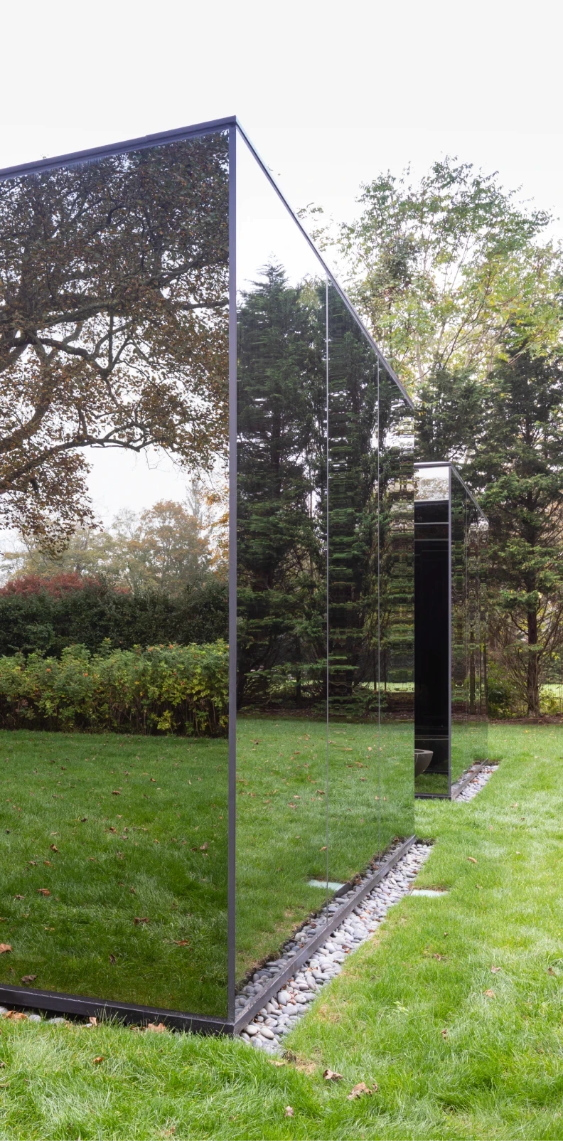 The structures are built from steel, concrete, and glass — a material palette chosen not for austerity but for disappearance. Full-height glass walls and floor-to-ceiling doors dissolve the boundary between inside and out, allowing the surrounding estate to remain the subject.