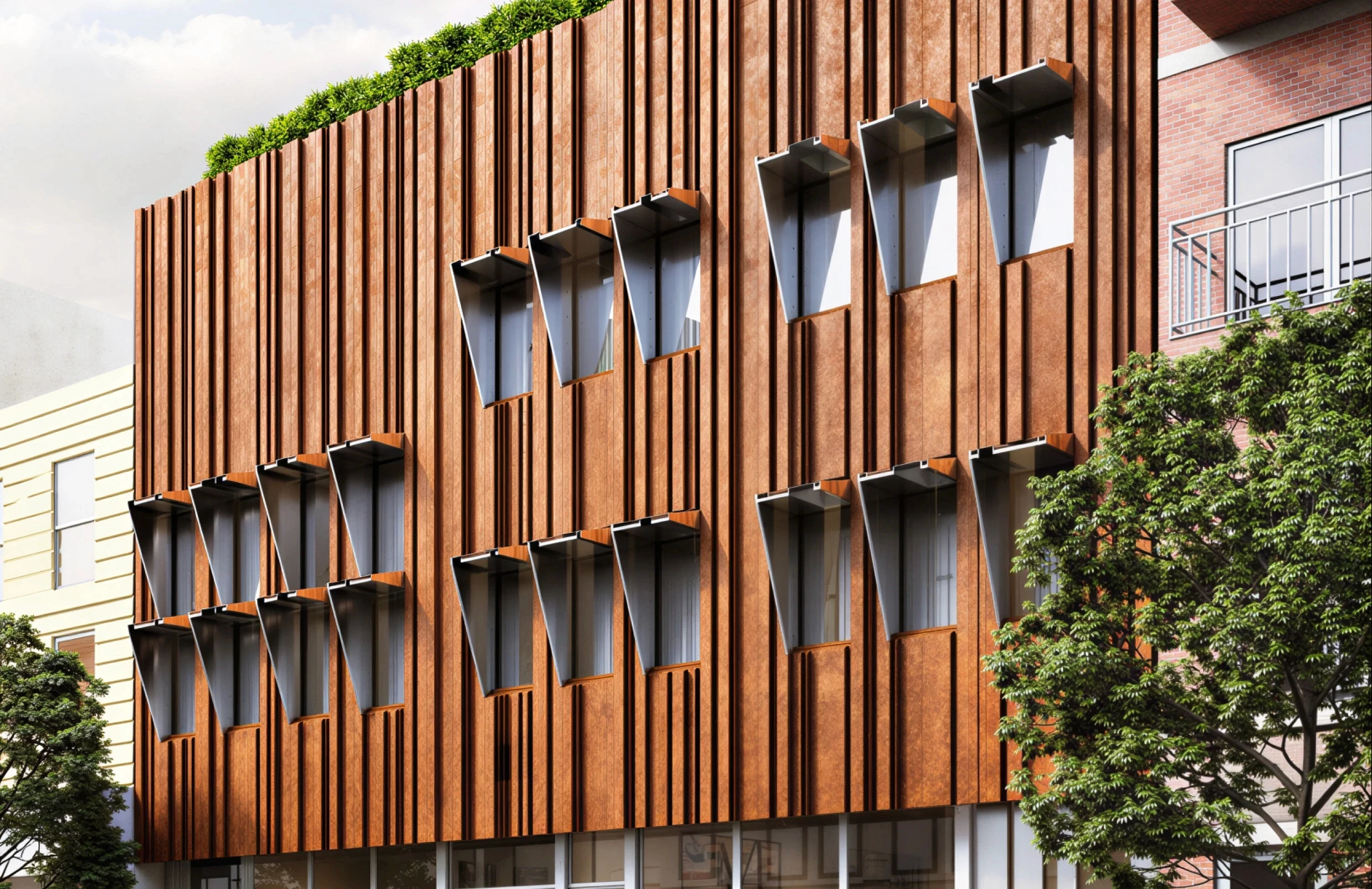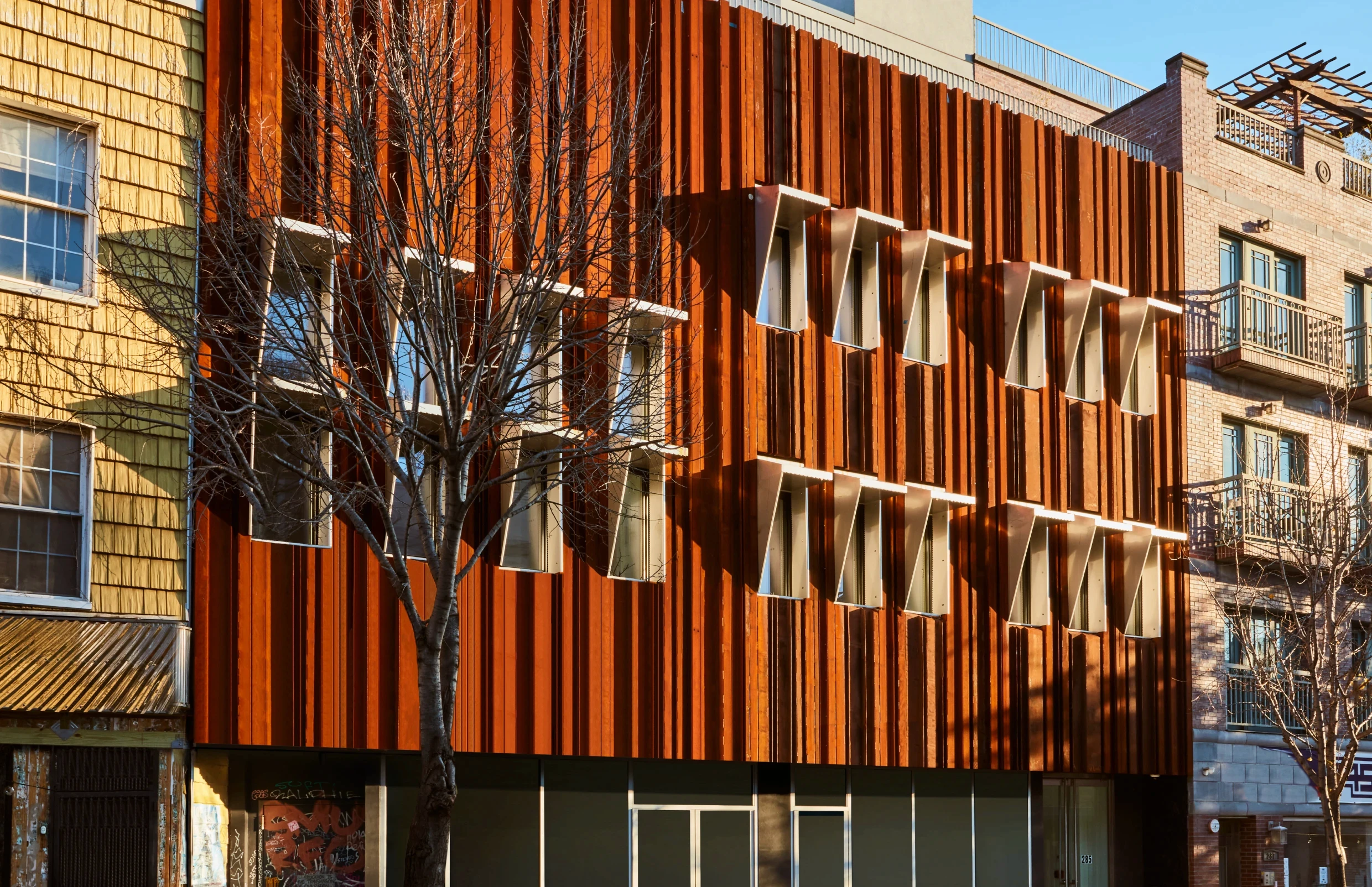 The exterior makes the building's intentions visible. A custom Corten steel façade — designed and detailed by Andrés — weathers naturally over time, developing a patina that ties the new construction to the industrial material culture of the surrounding Williamsburg streetscape.